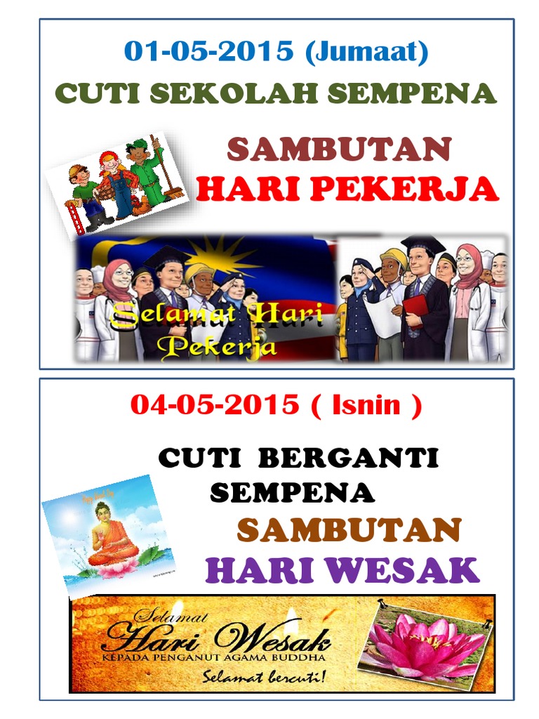 Dahlah masa hari bekerja tak sempat datang. ~ ~ hari wesak (tulisan jawi:هاري ويسک) merupakan hari terpenting bagi penganut agama buddha kerana hari wesak. Ketua setiausaha negara datuk seri dr ismail bakar menyatakan bahawa pengisytiharan hari kelepasan am tambahan. Audit amalan 5s oleh mpc. Kementerian sumber manusia dalam satu kenyataan hari ini memaklumkan program sambutan hari pekerja 2018 ditunda ke satu tarikh.
