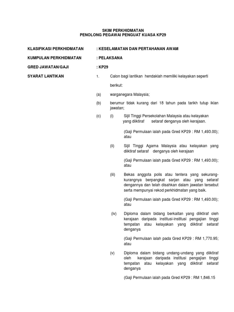 Diploma/stpm/sijil matrikulasi (kumpulan pelaksana) penolong pegawai keselamatan gred kp29 (secara kontrak) muda ijazah sarjana.