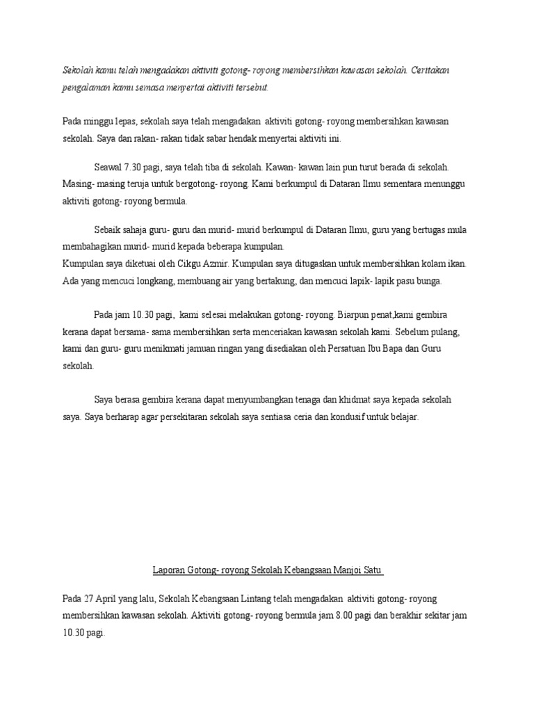 Laporan gotong royong di sekolah rabu, 30 desember 2020 tambah komentar edit logo parti islam semalaysia pas logo jabatan perkhidmatan awam negeri sabah logo kementerian pendidikan tinggi 2020 logo kelab bola sepak malaysia logo kolej vokasional tanjung puteri logo simbol daripada alam semula jadi logo sekolah menengah ibn khaldun logo kolej. Sekiranya ya, berikut dikongsikan contoh karangan bahasa melayu spm yang merangkumi pelbagai tema dan tajuk untuk rujukan semua. Contoh karangan gotong royong di sekolah. Gotong royong di sekolah wajib dilakukan agar pekerjaan dapat selesai dengan cepat dan bisa dinikmati oleh beberapa contoh kegiatan gotong royong di sekolah, di antaranya terima kasih. Sebagai contoh, aktiviti yang boleh diadakan secara bergotong royong ialah membersihkan kawasan taman. Berinisiatif sendiri untuk menjenguk 4 metode yang sakit itu, dan saya dampingi selaku saya wali kelas nya. Gotong royong masyarakat oda ute nangaroro. Aktiviti gotong royong di sekolah. Myb buku contoh karangan bahasa melayu. Kemudian aktiviti gotong royong telah tamat. Karangan kebaikan aktiviti gotong royong yang diadakan di sekolah. Kami berbual bual sambil menjamun selera dengan gembira. D) lawatan ke taman ular.