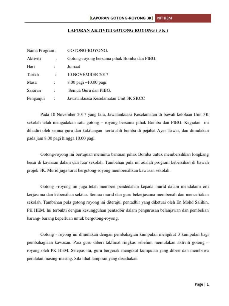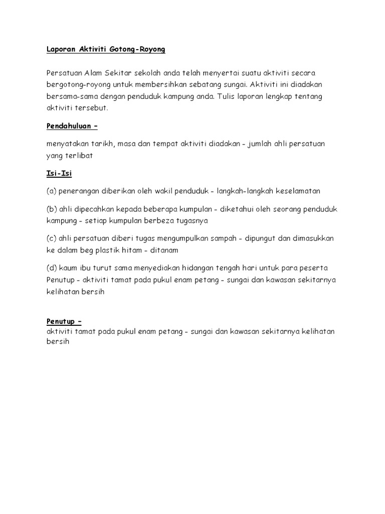 Program ini telah memberi pengalaman baru kepada Kemudian aktiviti gotong royong telah tamat. Laporan aktiviti gotong royong di kawasan perumahan. 10 contoh surat pemberitahuan berbagai kegiatan lengkap from www.nesabamedia.com sebagai contoh aktiviti yang boleh diadakan secara bergotong royong ialah membersihkan kawasan taman pada pukul 1100 pagi aktiviti gotong royong. Bagi calon yang akan menduduki peperiksaan sijil pelajaran malaysia (spm), anda dikehendaki menjawab soalan penulisan karangan bahasa melayu pada bahagian a dan bahagian b kertas 1.